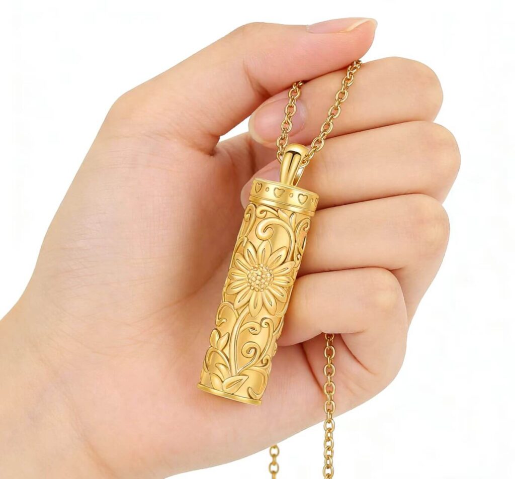 Let your beloved pet stay with you forever! This exquisite sunflower urn necklace is designed for pet lovers, holding a small amount of pet ashes, fur, or nail clippings, turning precious memories into a wearable keepsake. Necklace
