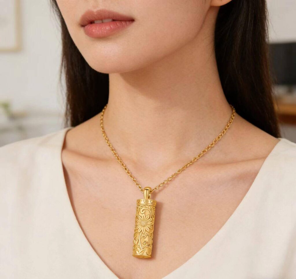 This pendant looks beautiful online, with a lovely floral design. However, after only a few weeks of wear, I’m worried the black enamel coating is starting to peel off. It still opens and closes smoothly and can safely hold ashes, so wearing it occasionally is fine, but I wouldn’t dare wear it every day.